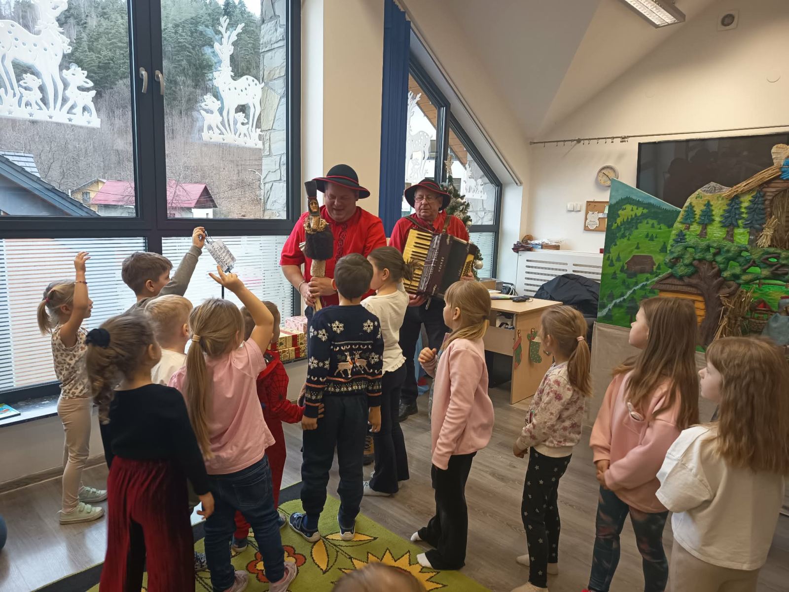 Przed świętami gościliśmy w przedszkolu Zespół Artystyczny „Roztoka” w składzie Roman, Marcin i Łukasz Kos. Panowie przedstawili historie, która oparta jest na opowieści o narodzinach Jezusa.