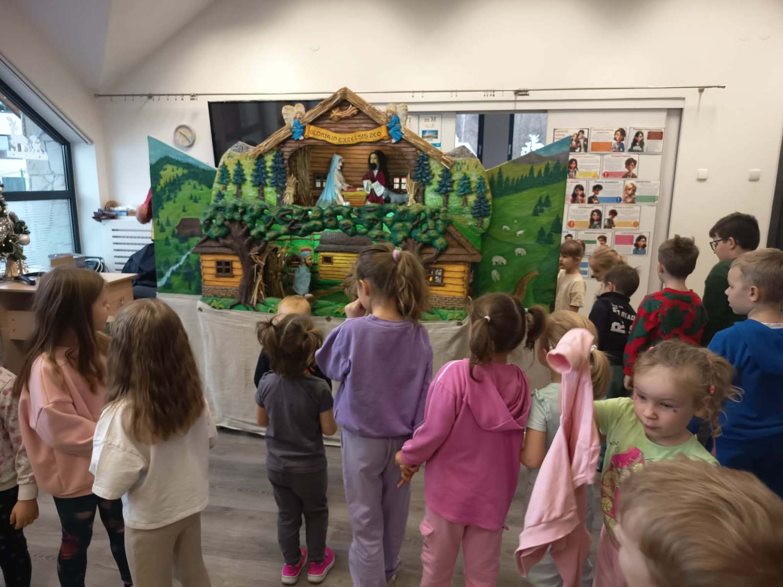 Przed świętami gościliśmy w przedszkolu Zespół Artystyczny „Roztoka” w składzie Roman, Marcin i Łukasz Kos. Panowie przedstawili historie, która oparta jest na opowieści o narodzinach Jezusa.