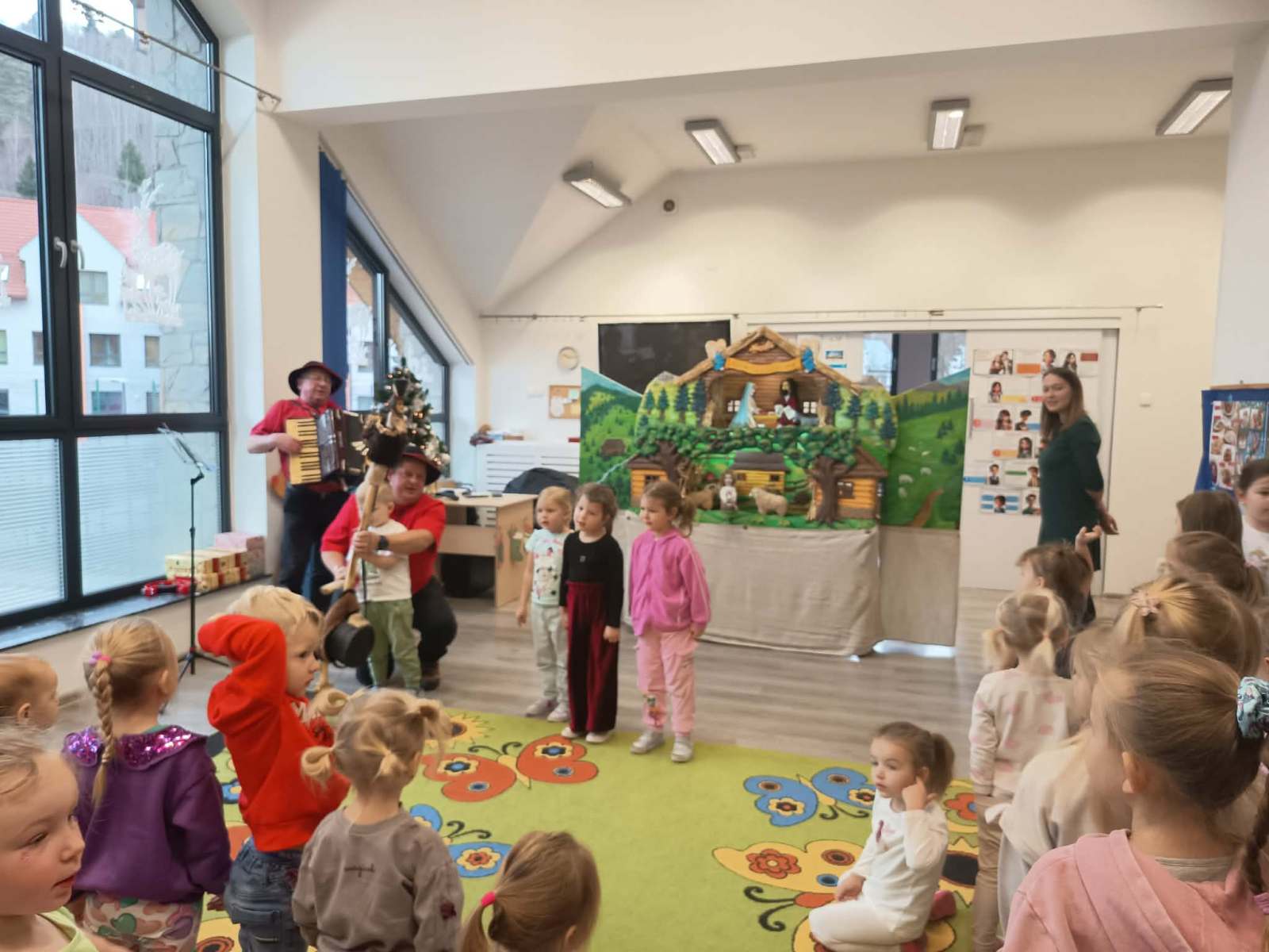 Przed świętami gościliśmy w przedszkolu Zespół Artystyczny „Roztoka” w składzie Roman, Marcin i Łukasz Kos. Panowie przedstawili historie, która oparta jest na opowieści o narodzinach Jezusa.