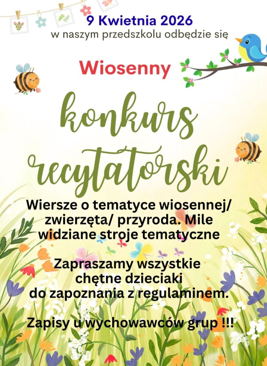 Zachęcamy gorąco wszystkie przedszkolaki do udziału w konkursie recytatorskim, który odbędzie się w naszym przedszkolu 9 kwietnia