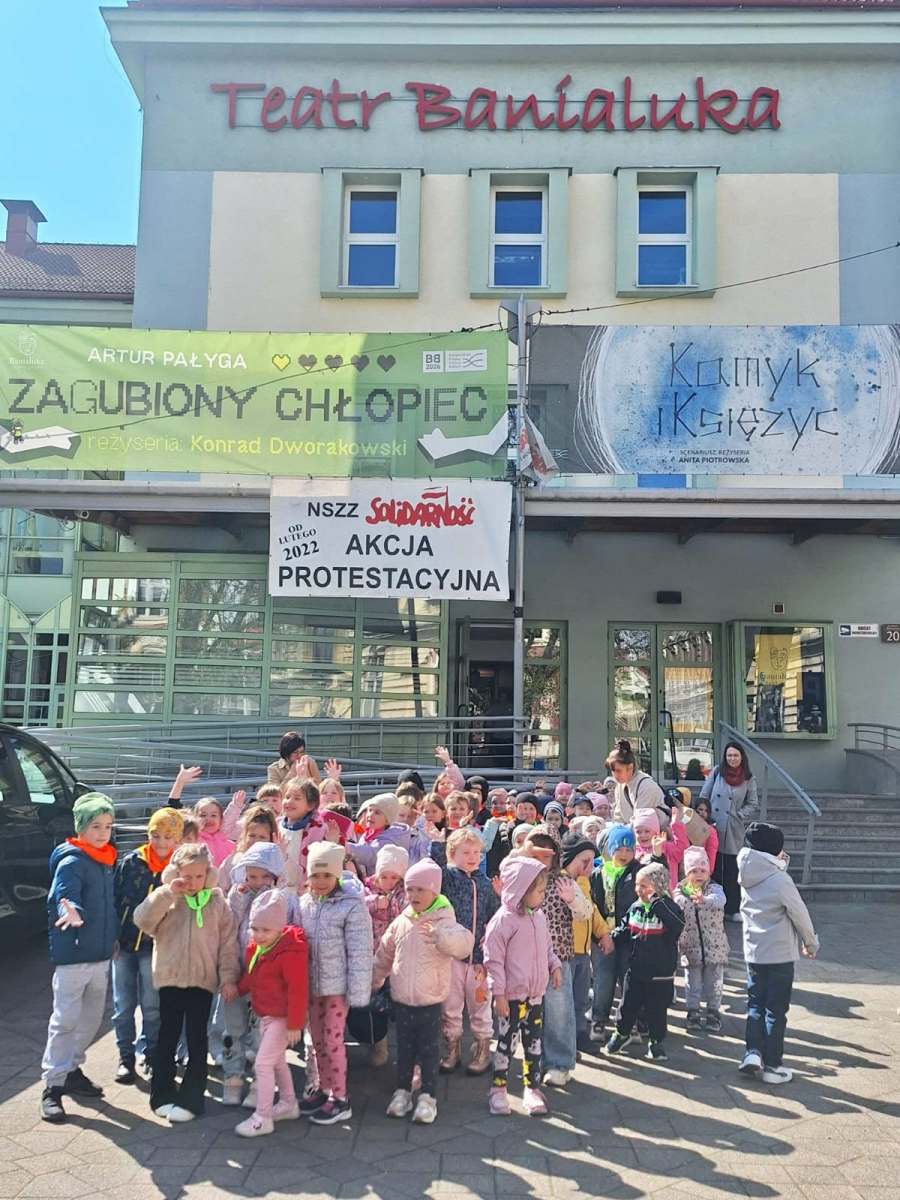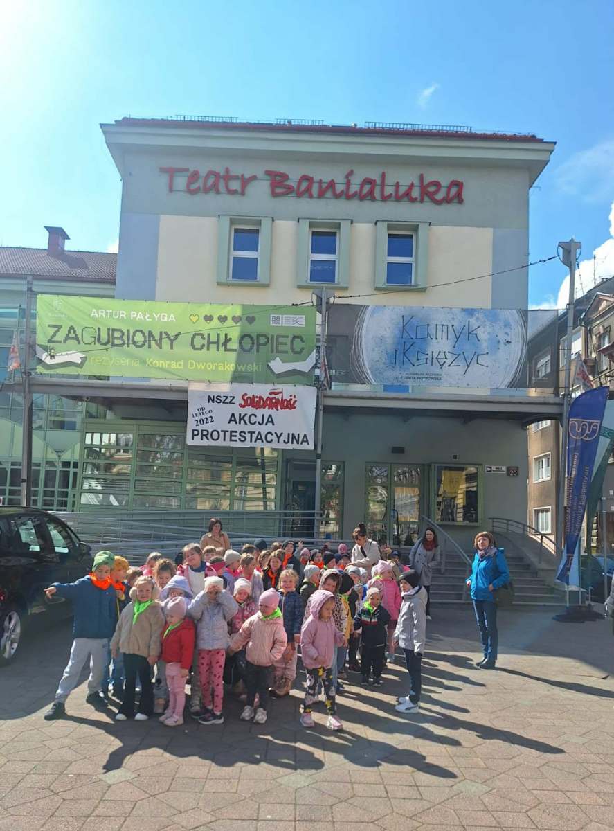 21 kwietnia nasze przedszkolaki wybrały się z wizytą do Teatru lalek Banialuka w Bielsku- Białej na bajkę pt:,, Po nitce do kłębka”.